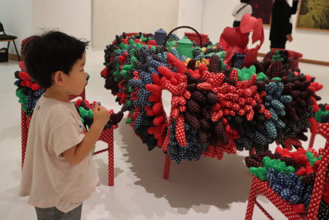 ・偶然居合わせた一年生の男の子とお母さんの親子二人組と一緒に鑑賞しました。最初から興味津々で、西村陽平の《穏やかな癒し》のところから男の子たちが離れないのです。「球体の中から話声がするようだ。返事をしていい?」と言い、作品から何か聞こえたのかいきなり球体に向かって話始めました。また、三木富雄の《EAR》の所でも、じ~と座り込んで耳の穴を5分程度見ていましたが、耳に向かって何か話し込んでいました。「向こうに届いたかな」と呟いていたので、自分たちで会話を楽しんでいる様子でした。草間彌生の作品の所でも二人で何か子供らしい会話をしていたようです。