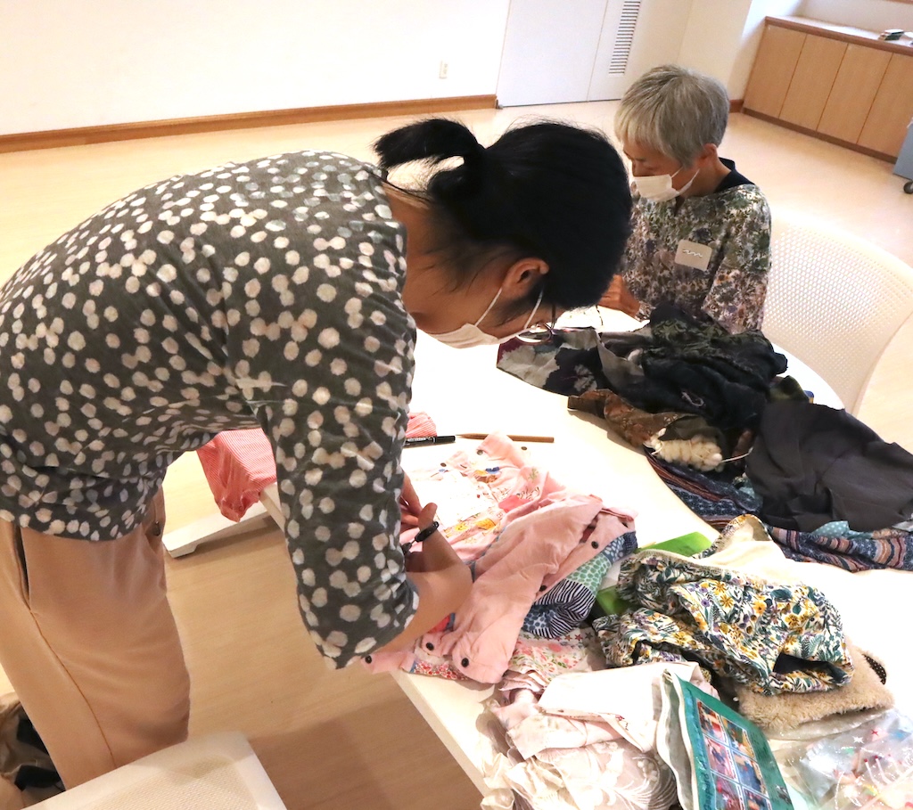 今回は大人向けワークショップなので、それぞれ思い出のある服やお気に入りの布地をたくさん持参してもらいました。(子供の小さい頃の服や形見の洋服、織物や着物生地、お気に入りの生地など)