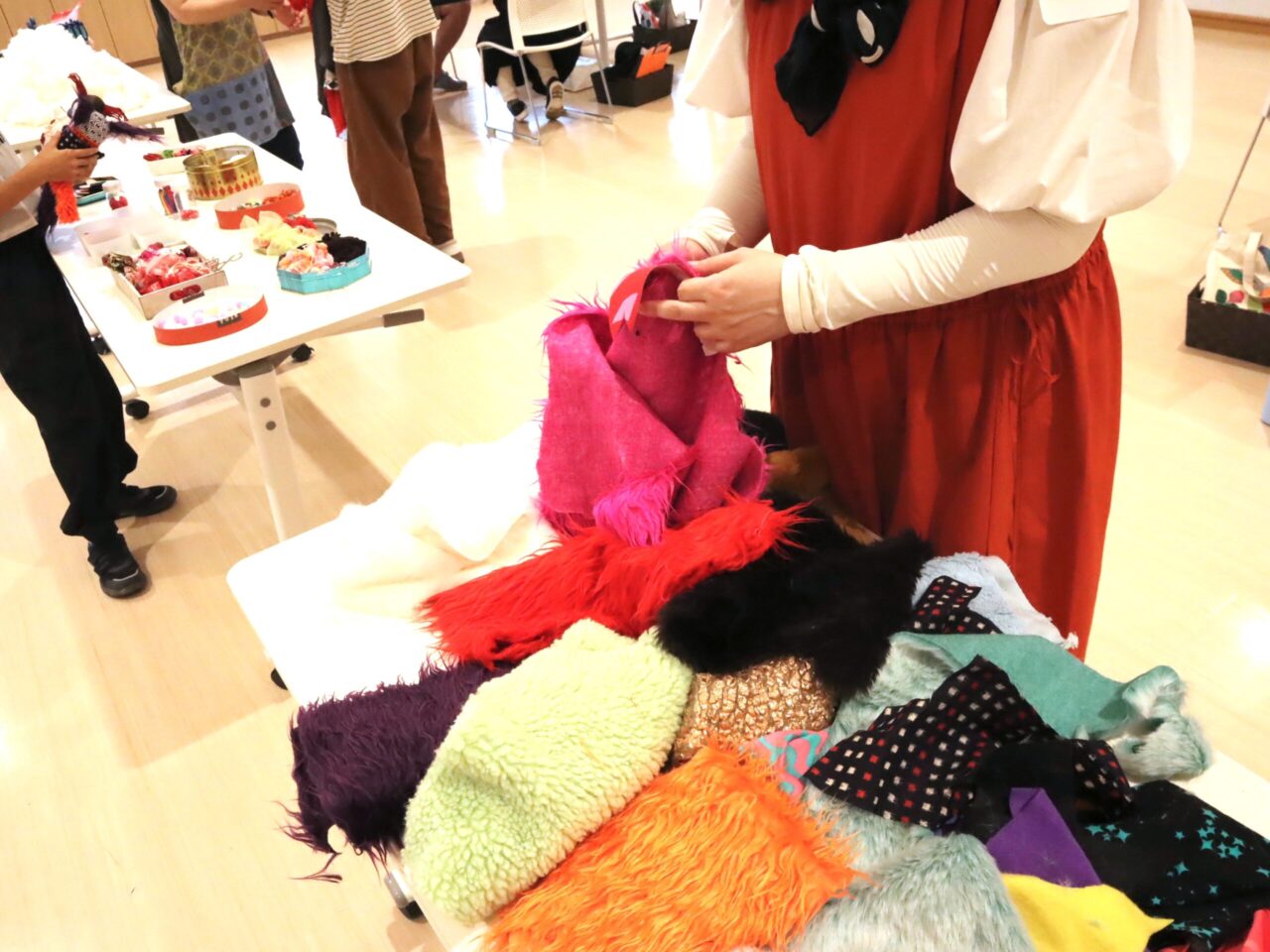 楽しいドーブツになるようにカラフルなファーや布やリボンなどのポイントとなる差し色を用意しました。