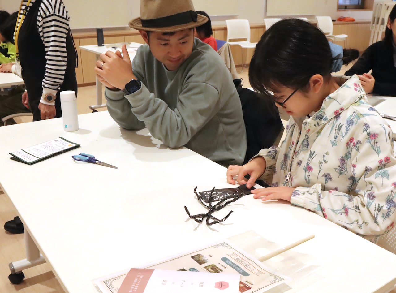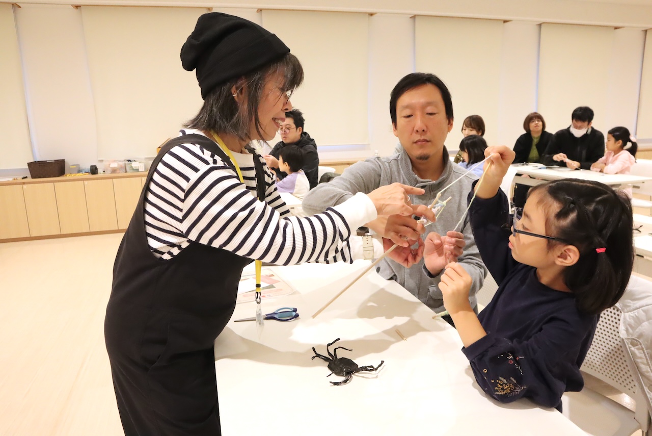 製作を楽しむだけではなく「昆虫への興味を深める」ことも目的としているこのワークショップ。まずは蜘蛛の巣のフシギについて講師が話をします。蜘蛛の巣にはいろんな形があることや、女郎蜘蛛の巣が3層構造になっていること、7種類の糸を使い分ける蜘蛛もいることなど、蜘蛛や蜘蛛の巣についてみんなでちょっぴり詳しくなってから、いよいよ蜘蛛の製作です。