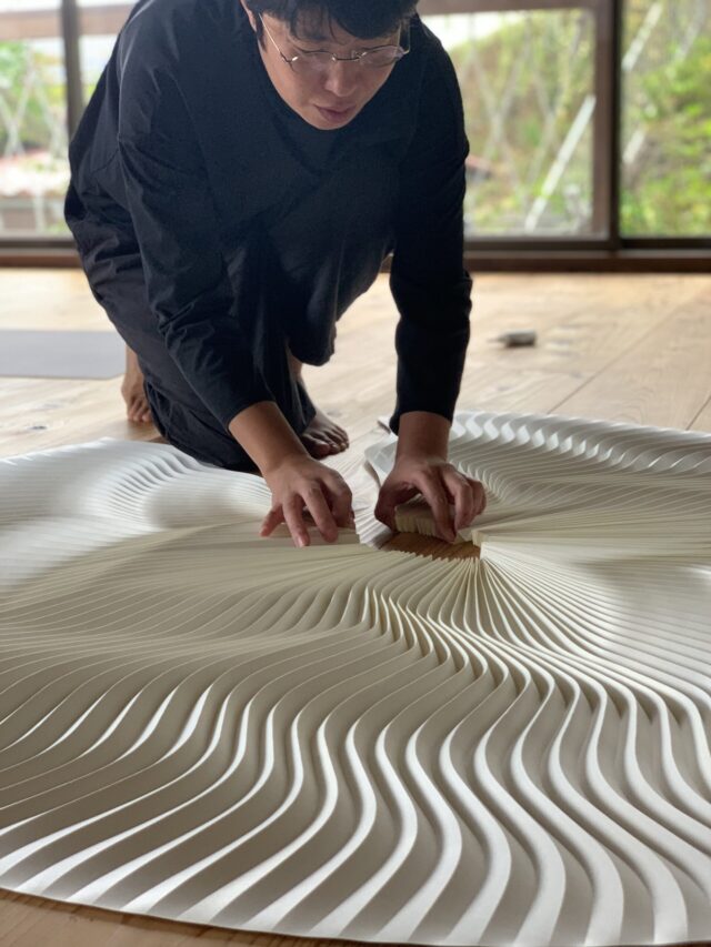 「折る」という行為における紙の造形表現の可能性を追求してきた作家の西村優子さんは、植物の繊維から人の手によってつくられ、その言葉や行為を受けとめて記憶し、役割を終えれば灰となりあるいは水に解かれ、自然へと還っていく「紙」のたどる時間を、人間の一生になぞらえて愛おしみます。