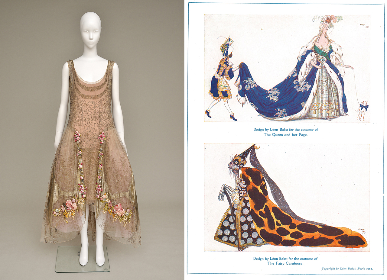 (左から)ブーエ姉妹《イヴニング・ドレス》1920年代 共立女子大学博物館蔵、《バレエ・リュス公式プログラム『眠り姫』》イギリス:アルハンブラ劇場 1921年 兵庫県⽴芸術⽂化センター 薄井憲⼆バレエ・コレクション
