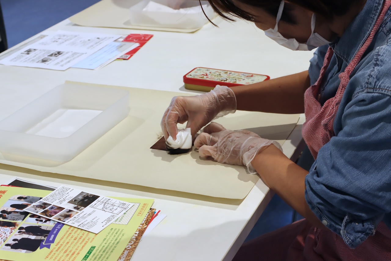 名刺サイズの下絵をご自身で準備し、プロ用のプレス機を使った作品を持ち帰りましょう。