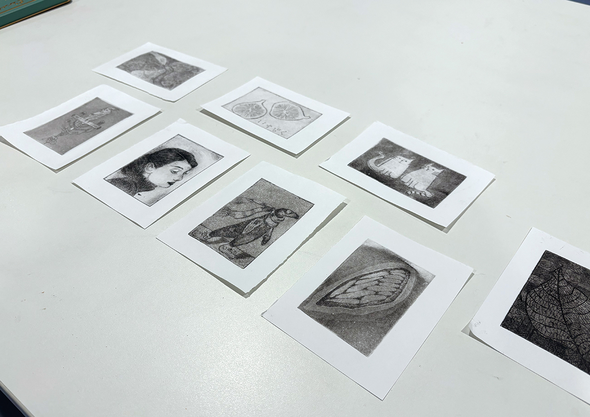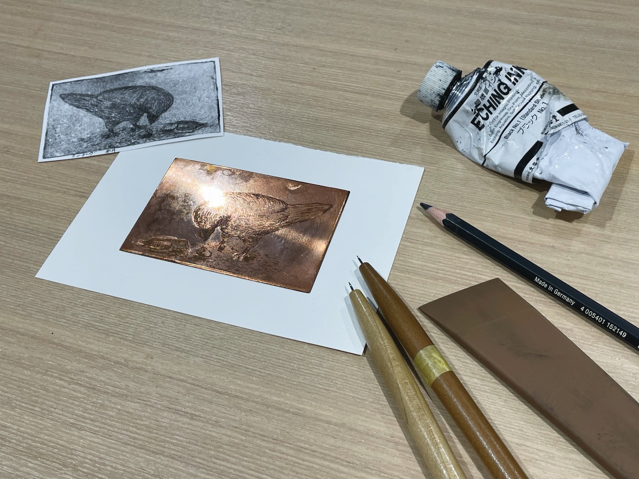エッチングはニードルで掻いて腐食させた線で表現する、基本的な銅版画の技法で、1日で彫りから刷りまでを行うことができます。