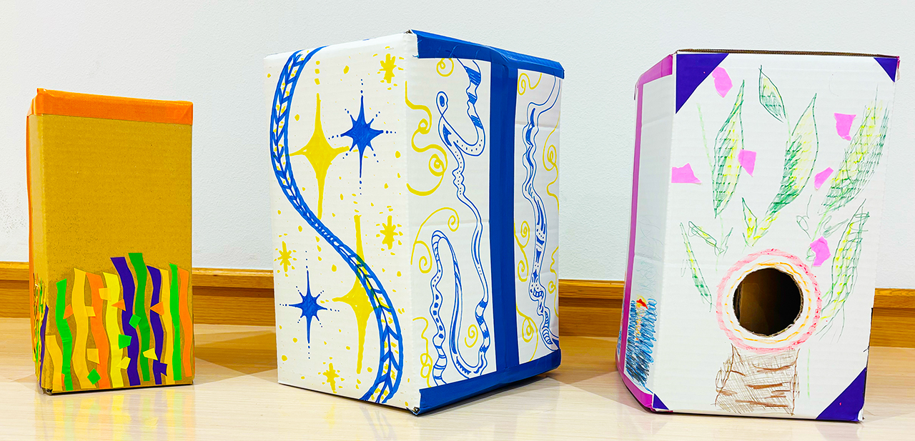 音楽から広がるイメージをつかまえて描き、オリジナルのカホン(打楽器)を作ります。最後は皆で一緒にアンサンブルも楽しみましょう♪